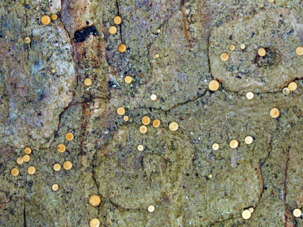 Kasvab happelisel puukoorel, puude jalamil sügavais koorepragudes, harvem puidul ja sammaldel.