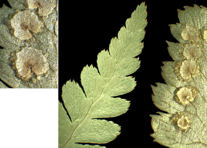 Sõkalsoomused leherootsul kahevärvilised, keskelt tumepruunid kuni mustad, serval helepruunid. Eoslate kattemembraan varreliste näärmetega